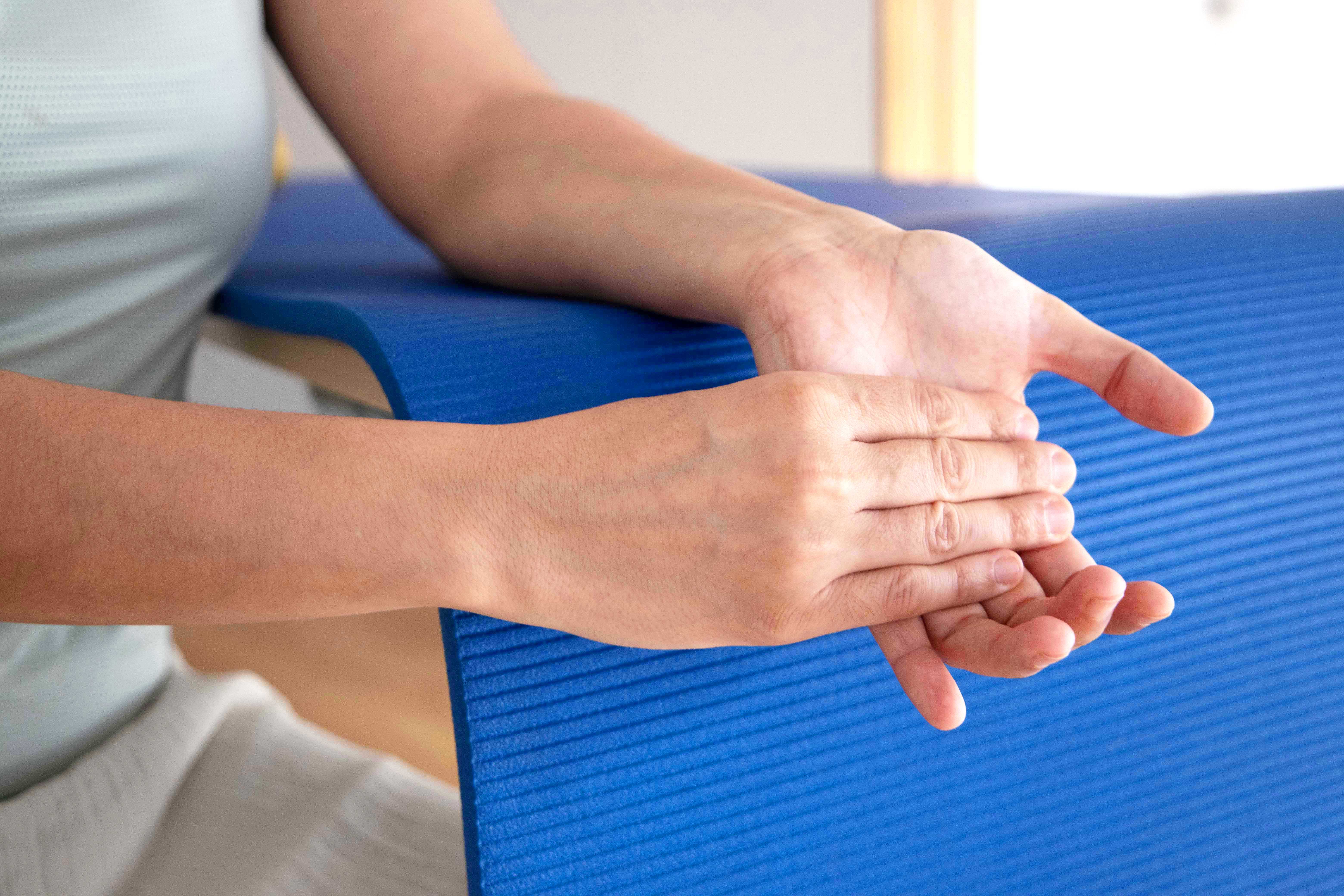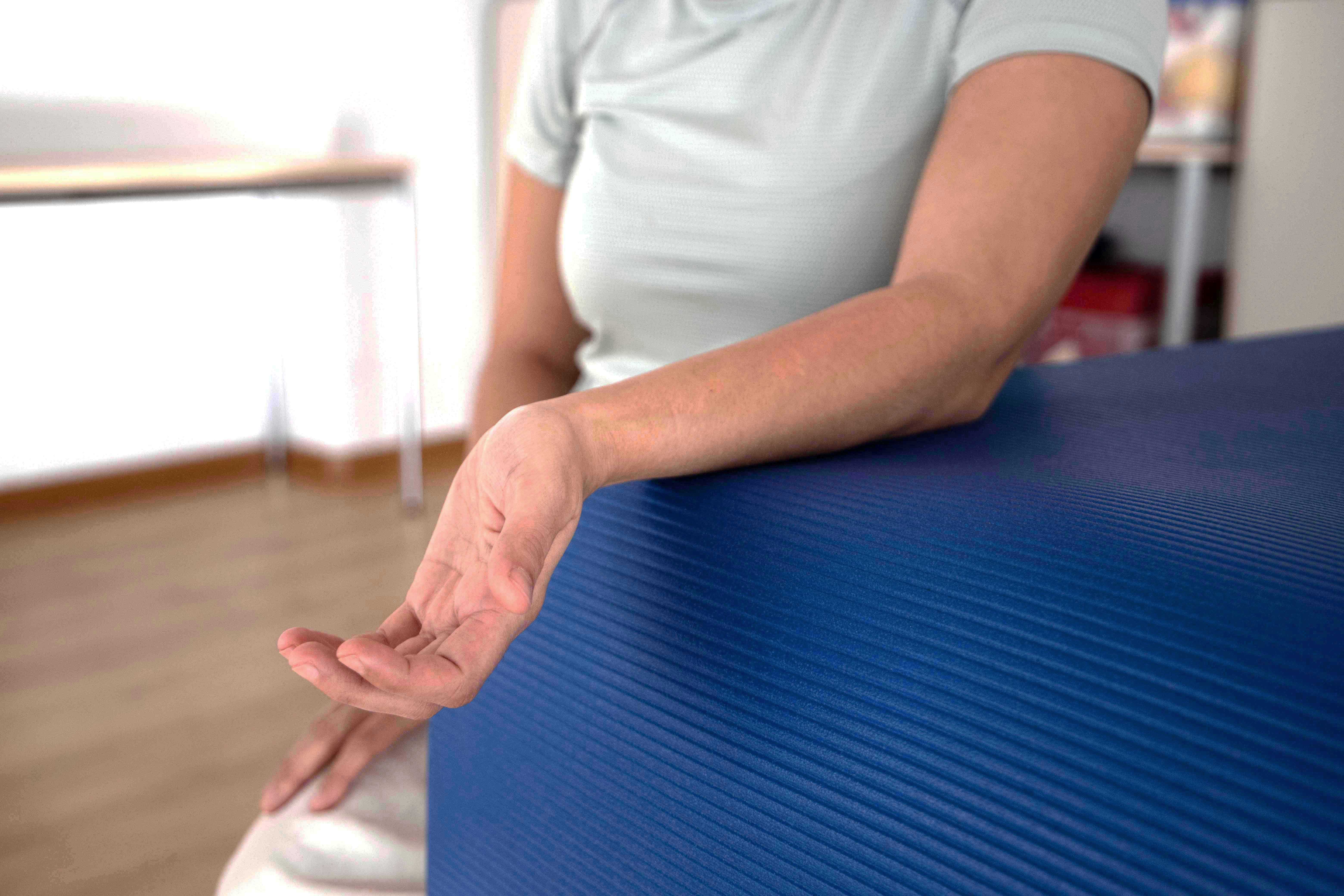 Ausgangsposition: Sitzend am Tisch, Unterarm liegt auf, Hand hängt über Tischkante, Handrücken zeigt nach oben.